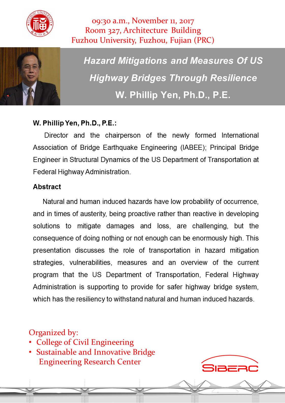 11月11日上午9:30,美国W.Phillip Yen, Ph.D.,P.E.将在建筑学院327室为大家带来主题为“Hazard Mitigations and Measures Of US Highway Bridges Through Resilience”的前沿报告。热烈欢迎大家参加。详情请见海报。