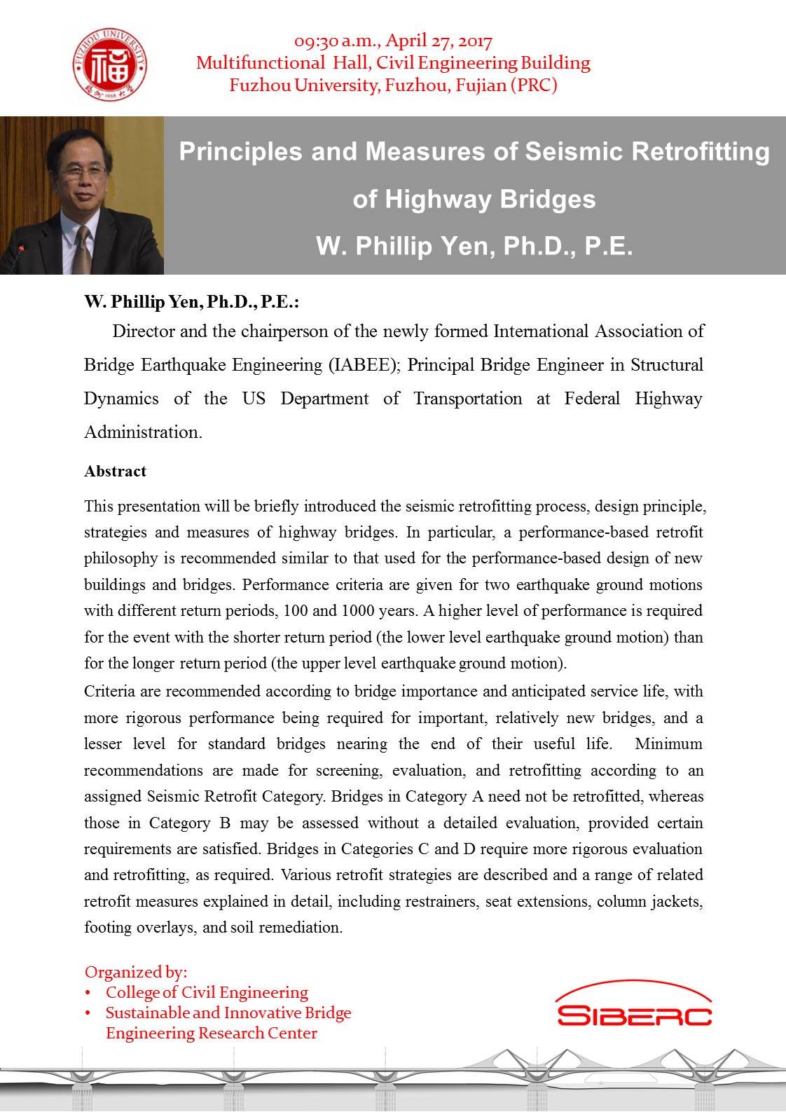 4月27日上午9:30,美国W.Phillip Yen, Ph.D.,P.E.将在土木学院多功能厅为大家带来主题为“Principles and Measures of Seismic Retrofitting of Highway Bridges”的前沿报告。热烈欢迎大家参加。详情请见海报。