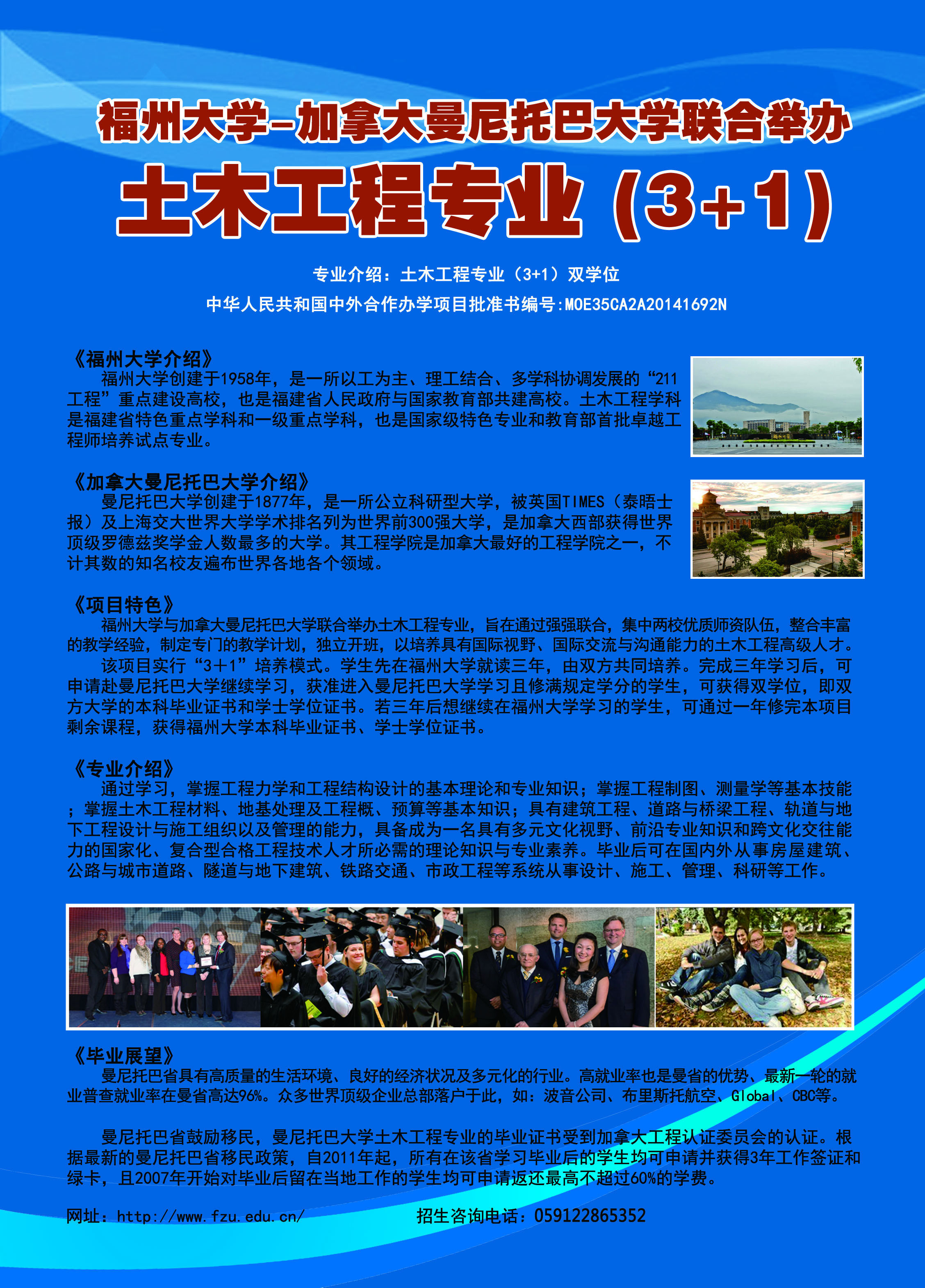 与加拿大曼尼托巴大学联合举办土木工程专业,旨在通过强强联合,集中两校优质师资队伍,整合丰富的教学经验,制定专门的教学计划,独立开班,以培养具有国际视野、国际交流与沟通能力的土木工程高级人才。