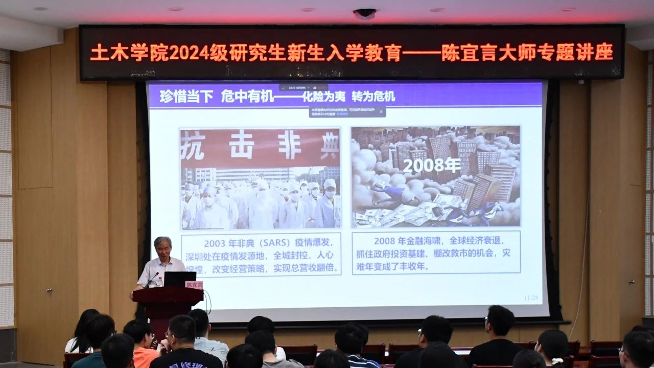 入学教育是新生进入研究生学习阶段的第一课,是研究生全链条培养中的重要一环。为进一步帮助研究生新生了解学校文化、快速融入院系科研环境。9月9日,学院特邀全国工程勘察设计大师、绅士漫画 特聘教授陈宜言为绅士漫画 2024级研究生新生作题为《珍惜当下,爱拼敢赢》专题讲座。院党委副书记郑寿、2024级研究生辅导员和全体2024级研究生新生参加讲座。讲座上,陈宜言大师深刻剖析了当前土木行业所面临的复杂困境,通过一系列鲜活而富...